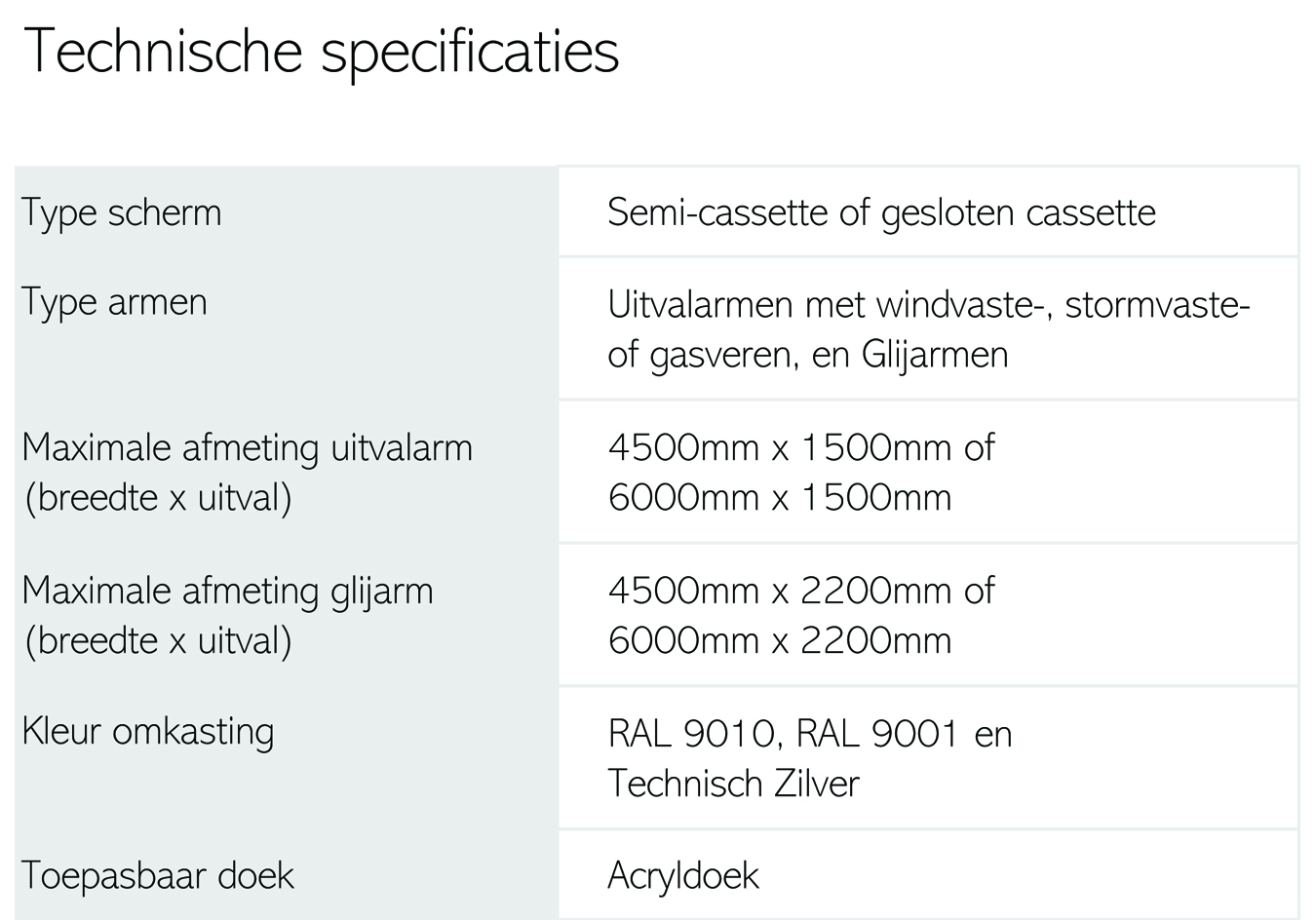 De Vista Elégance is leverbaar als type 95 (max. 4500 mm breed) met een afgeschuinde of rechte kast, en als type 110 (max. 6000 mm breed) met een afgeschuinde kast. Naast de standaard kleuren is op aanvraag iedere RAL-kleur leverbaar.