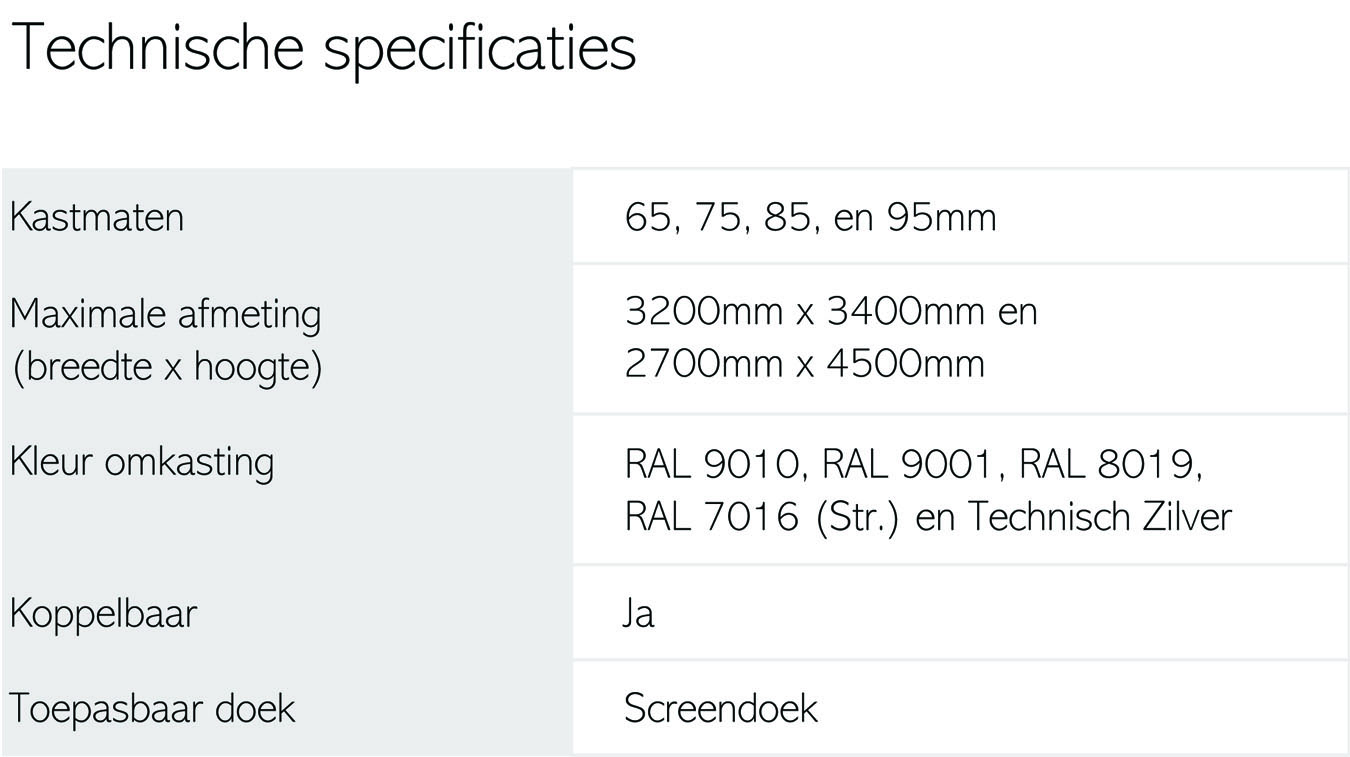 Deze vlak hangende verticale zonwering is geschikt voor vrijwel iedere situatie en heeft een zeer gunstige prijsstelling. De Excellent screen is dan ook zeer populair als buitenzonwering voor particulieren. Indien de screen zeer windbestendig moet zijn, raden wij u de Excellent screen windvast of de SolidScreen aan. De Solidscreen is bestand tegen windsnelheden tot 145 km/h (12 Beaufort).