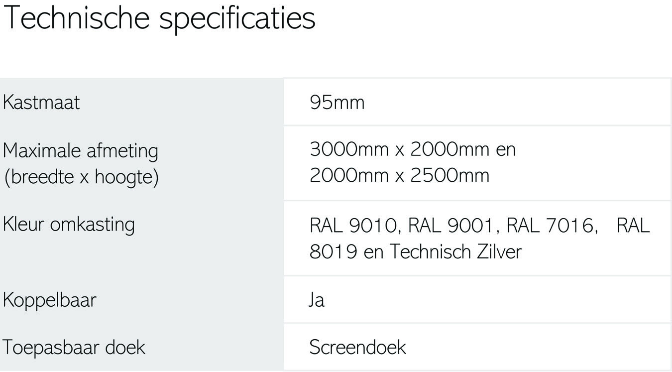 Door de Excellent screen te voorzien van o.a. een stevige koordspanner en veersysteem, wordt de Excellent screen Windvast. De onderlijst en het doek staan dankzij deze ingenieuze onderdelen in iedere positie onder spanning, waardoor de onderlijst niet rammelt en het doek niet opwaait. Dit maakt de screen tevens uitstekend toepasbaar op grote hoogten en op plaatsen waar veel wind staat. Daarnaast is het mogelijk om het op hellende ramen te monteren. De windvaste Excellent screen kan zowel met hand- als elektrische bediening worden uitgevoerd.